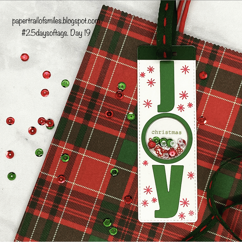 I started making the tag with the intention of matching it to a red and green plaid gift bag. But once it was done, I thought it would be cute to tie it to a clear cello bag filled with dog treats. It's only by coincidence that when I got some of our sweet Sadie's dog treats out to take a picture of the tag, that I realized that they have 'woof' on them. So cute that the treats match the 'Merry woof woof' sentiment inside the shaker!